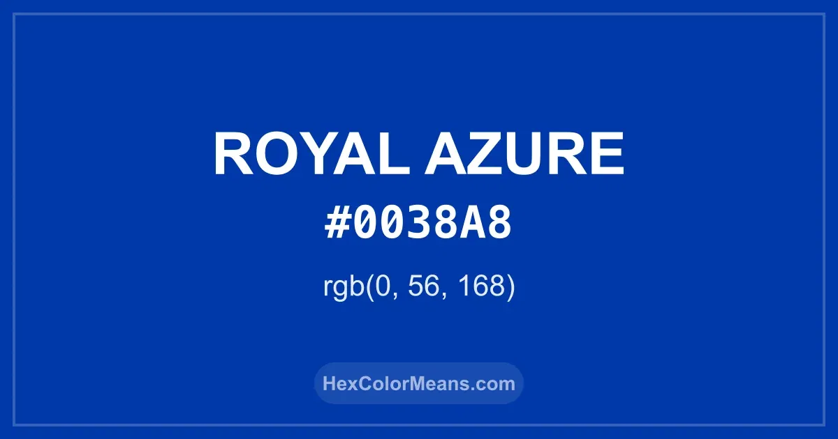 Detailed RGB and CMYK values of Royal Azure (#0038a8) displayed in a horizontal bar provide clear reference for digital and print color accuracy.