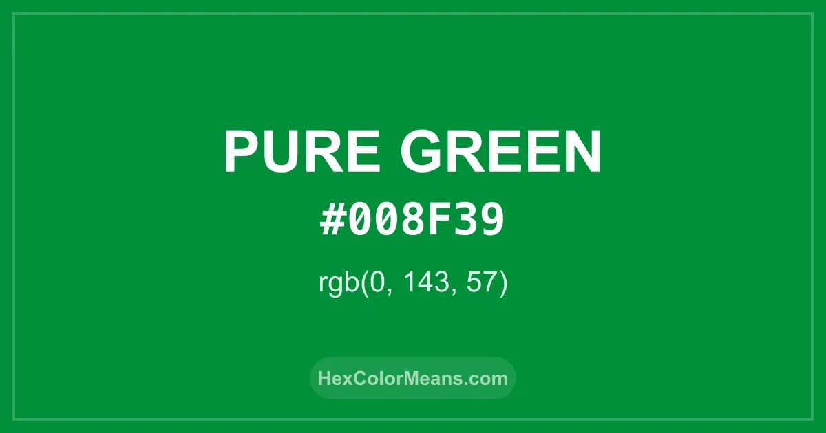 Detailed RGB and CMYK values of Pure Green (#008f39) displayed in a horizontal bar provide clear reference for digital and print color accuracy.