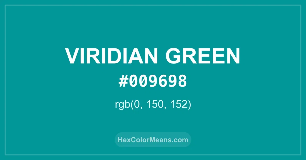 Detailed RGB and CMYK values of Viridian Green (#009698) displayed in a horizontal bar provide clear reference for digital and print color accuracy.