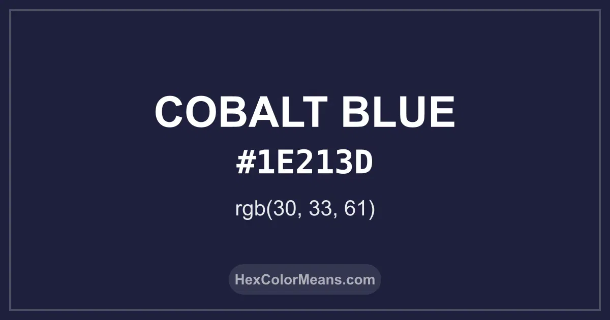 Cobalt Blue (#1e213d) RGB value is (30, 33, 61). The hex color red value is 30, green is 33, and blue is 61. Its HSL format shows a hue of 234°, saturation of 34%, and lightness of 18%, while the CMYK process values are 51%, 46%, 0%, and 76%.