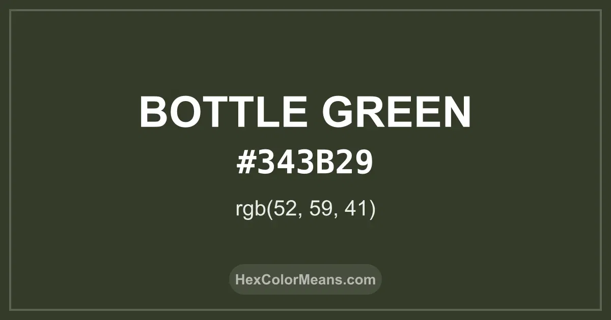 Detailed RGB and CMYK values of Bottle Green (#343b29) displayed in a horizontal bar provide clear reference for digital and print color accuracy.