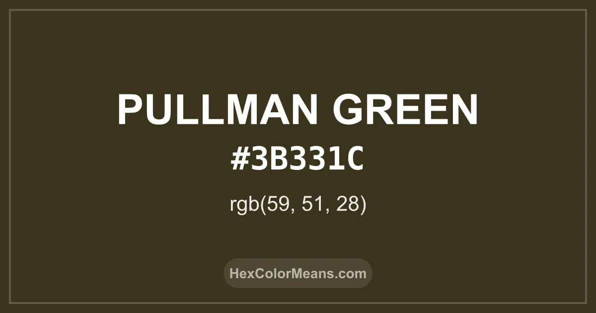 Detailed RGB and CMYK values of Pullman Green (#3b331c) displayed in a horizontal bar provide clear reference for digital and print color accuracy.