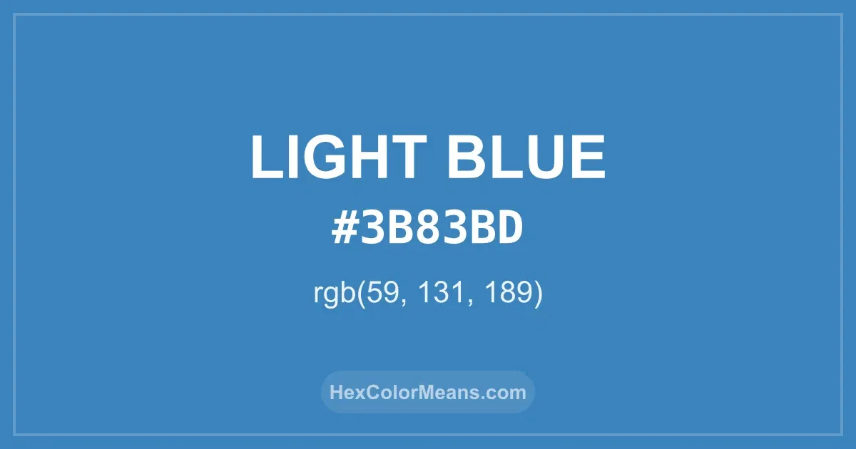 Light Blue (#3b83bd) RGB value is (59, 131, 189). The hex color red value is 59, green is 131, and blue is 189. Its HSL format shows a hue of 207°, saturation of 52%, and lightness of 49%, while the CMYK process values are 69%, 31%, 0%, and 26%.