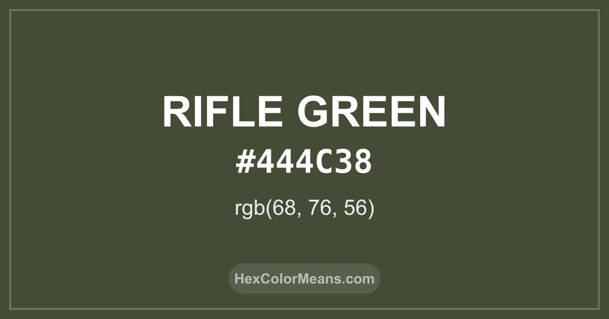 Detailed RGB and CMYK values of Rifle Green (#444c38) displayed in a horizontal bar provide clear reference for digital and print color accuracy.