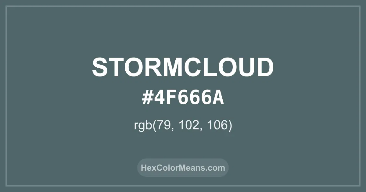 Stormcloud (#4f666a) RGB value is (79, 102, 106). The hex color red value is 79, green is 102, and blue is 106. Its HSL format shows a hue of 189°, saturation of 15%, and lightness of 36%, while the CMYK process values are 25%, 4%, 0%, and 58%.