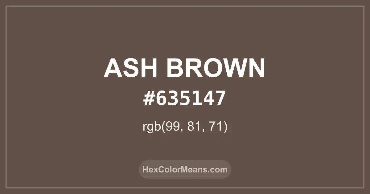Detailed RGB and CMYK values of Ash Brown (#635147) displayed in a horizontal bar provide clear reference for digital and print color accuracy.