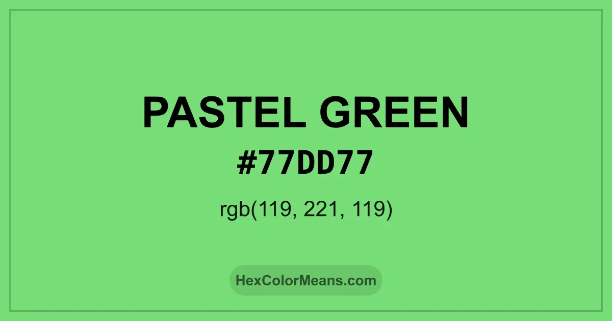 Detailed RGB and CMYK values of Pastel Green (#77dd77) displayed in a horizontal bar provide clear reference for digital and print color accuracy.