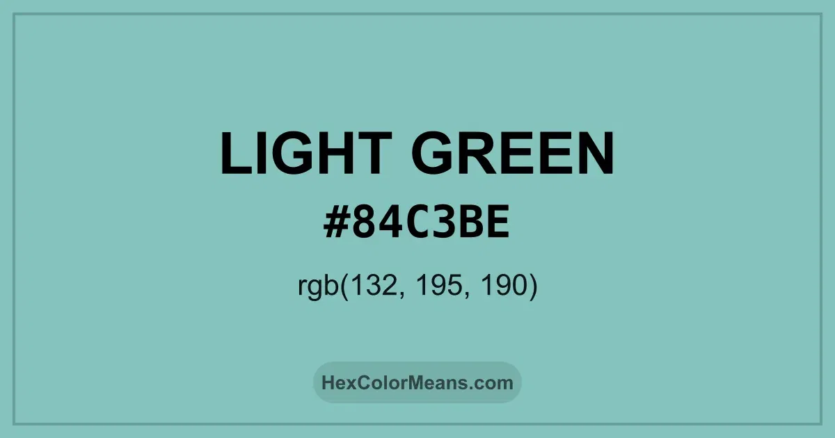 Light Green (#84c3be) RGB value is (132, 195, 190). The hex color red value is 132, green is 195, and blue is 190. Its HSL format shows a hue of 175°, saturation of 34%, and lightness of 64%, while the CMYK process values are 32%, 0%, 3%, and 24%.