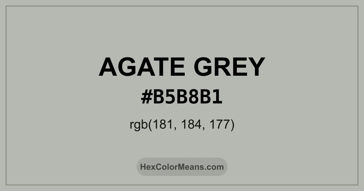Agate Grey (#b5b8b1) RGB value is (181, 184, 177). The hex color red value is 181, green is 184, and blue is 177. Its HSL format shows a hue of 86°, saturation of 5%, and lightness of 71%, while the CMYK process values are 2%, 0%, 4%, and 28%.