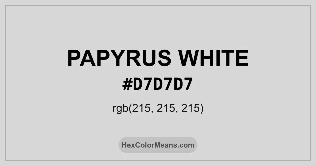 Papyrus White (#d7d7d7) RGB value is (215, 215, 215). The hex color red value is 215, green is 215, and blue is 215. Its HSL format shows a hue of 0°, saturation of 0%, and lightness of 84%, while the CMYK process values are 0%, 0%, 0%, and 16%.