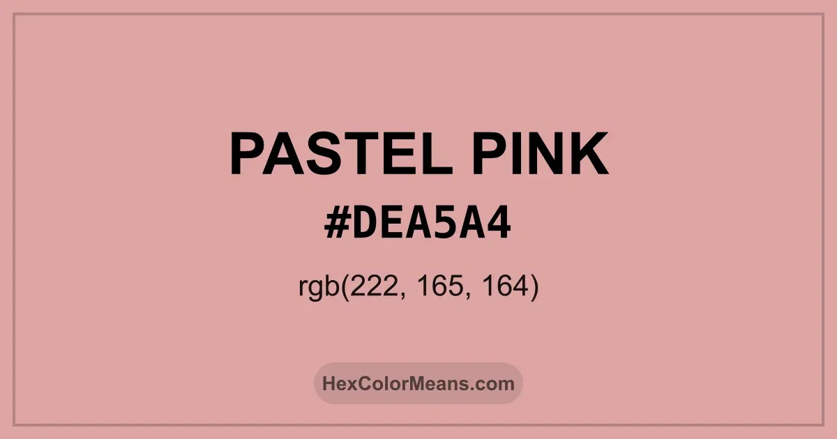 Detailed RGB and CMYK values of Pastel Pink (#dea5a4) displayed in a horizontal bar provide clear reference for digital and print color accuracy.