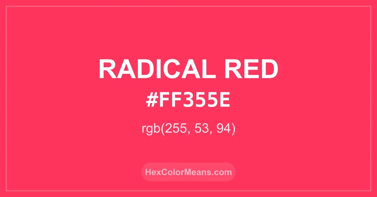 Detailed RGB and CMYK values of Radical Red (#ff355e) displayed in a horizontal bar provide clear reference for digital and print color accuracy.