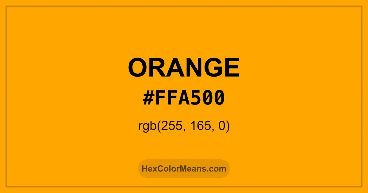Orange (#ffa500) RGB value is (255, 165, 0). The hex color red value is 255, green is 165, and blue is 0. Its HSL format shows a hue of 39°, saturation of 100%, and lightness of 50%, while the CMYK process values are 0%, 35%, 100%, and 0%.